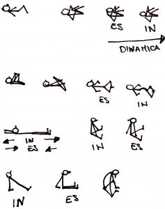 - Portarsi in posizione seduta con le gambe larghe quanto le spalle ed i piedi a martello, le mani vengono posizionate sulle ginocchia corrispondenti; la parte bassa dell’addome è tonica per permettere alla colonna di allungarsi senza eccessiva tensione dei muscoli posteriori. Espirando scivolare con le mani sul pavimento facendo ruotare il busto e la testa verso destra, inspirando ritornare al centro e poi ripetere il movimento nella parte opposta.